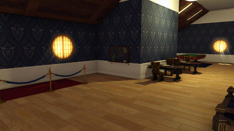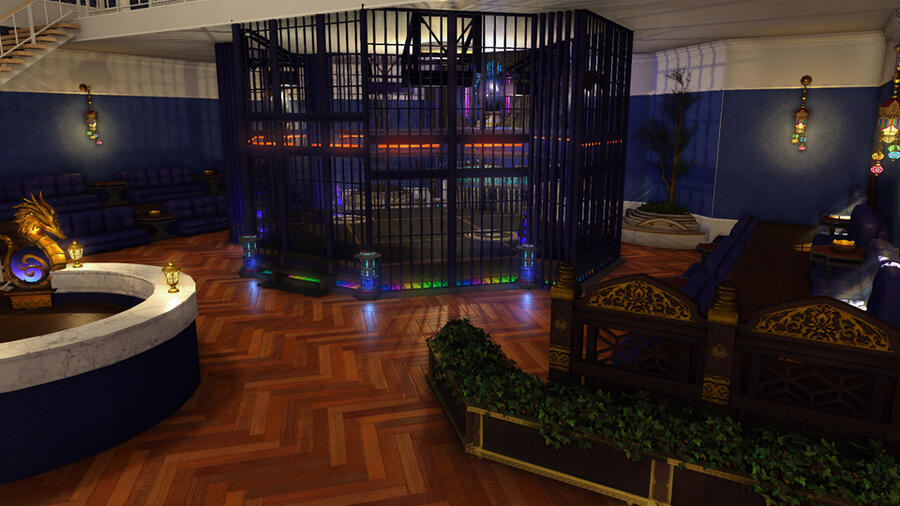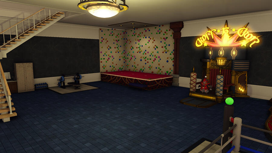 Upper and Lower FloorsOn the right side of the upper floor (above the cage) guests will find an entertainment room for all to use, with tables for Triple Triad, a dart board and a pool table for all to enjoy.On the Lower for is our training and recreation room, whilst open to the public, it is a place for fighters to work out and train within the ring, with weights or even on the climbing wall; or they can unwind and blow off some steam on the Gold Saucer sponsored machines!