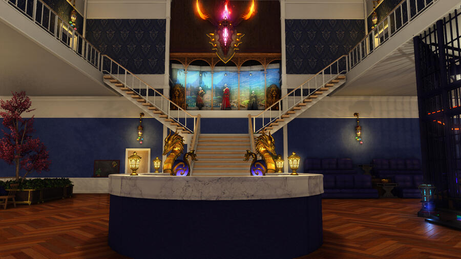 To the right you will see the main attraction of the Respite, the Cage that holds the bouts for the Eorzea's Greatest Fighter! Flanked by plentiful seating for onlooking and an announcer booth, the cage provides a restricted area to fight in, but also along with the help of the aetherial barrier keeps the fights contained with in for the audiences enjoyment!Lastly the Centre of the room is taken by our Promotion Podium, a stage were Fighters may make announcements, challenges or banter to build up hype for future events and fights! (Fighters and Guests may also use this platform to promote other Venues if they contact a member of staff.)Above it, stand the statues of the current champions who reign over the rest of the EGF, a monument to their hard work within these walls.